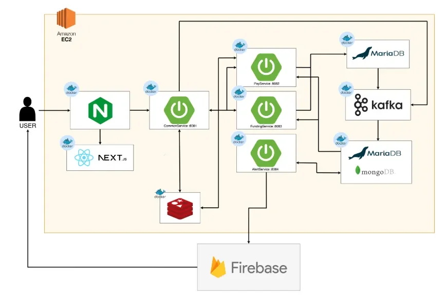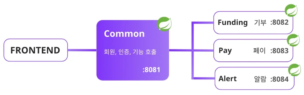 기능별 마이크로서비스 분리(User/Pay/Donation/Notification), API Gateway를 통한 인증/라우팅 처리, 프론트엔드별 맞춤형 BFF 레이어 구성, OpenFeign 기반 선언형 HTTP 통신으로 가독성 및 fallback 처리를 통한 안정성을 확보했습니다.